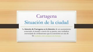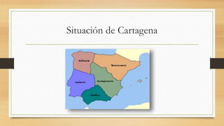 El documento proporciona información sobre la historia y fundación de la ciudad de Cartagena en España. Se menciona que la ciudad fue fundada originalmente por Teucro en 1184 a.C. con el nombre de Tucria, aunque otros creen que ya existía bajo el nombre de Contesta fundada por el rey Testa en 1412 a.C. Más tarde, en el año 225 a.C., el general cartaginés Asdrúbal la refundó y le dio su nombre actual. El documento también describe algunas características de la arquitectura romana encontrada en Cart