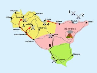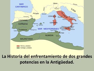 Este documento describe el enfrentamiento entre las antiguas potencias de Cartago y Roma. Los mamertinos, mercenarios italianos establecidos en Sicilia, pidieron protección a Roma, lo que llevó a la Primera Guerra Púnica entre Cartago y Roma por el control de Sicilia e islas cercanas desde 264 a 241 a.C. La guerra terminó con la victoria romana y el abandono de Cartago de sus reclamos sobre Sicilia.