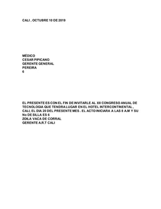 El documento contiene 20 invitaciones para asistir al XII Congreso Anual de Tecnología que se llevará a cabo el 20 de octubre en el Hotel Intercontinental de Cali. Cada invitación incluye el nombre, profesión y lugar de origen de la persona invitada, así como el número de silla que se le ha asignado.
