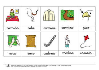 El documento presenta una lista de pictogramas de palabras que comienzan con la letra C, incluyendo objetos como casa, cama y comida, así como acciones como correr, cantar y columpiarse. Cada pictograma viene acompañado de información de contacto de los Servicios de Apoyo del colegio Juan de Yepes en Ávila.