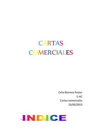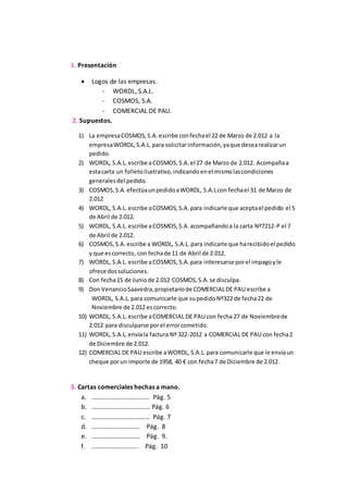 Este documento describe una serie de intercambios comerciales entre tres empresas - COSMOS, S.A., WORDL, S.A.L., y COMERCIAL DE PAU - que involucran solicitudes de información, pedidos, confirmaciones, retrasos, disculpas y pagos. Se enumeran 12 supuestos que resumen las comunicaciones entre las empresas sobre estos asuntos a lo largo de 2012. El documento también incluye ejemplos de cartas comerciales escritas a mano y por computadora entre las empresas.