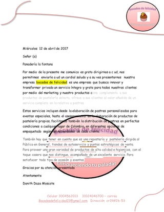 La empresa Bocados de Felicidad se presenta a varias panaderías ofreciendo sus servicios de repostería y pastelería, los cuales incluyen la elaboración de postres personalizados, asesoramiento en la elaboración de productos y distribución de postres. La empresa busca complementar los productos de las panaderías y ofrecer un servicio completo en relación con los postres.