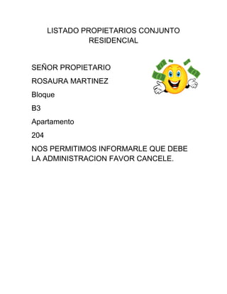 El documento presenta un listado de 5 propietarios de apartamentos en un conjunto residencial, indicando sus nombres, los bloques y apartamentos de cada uno, y un mensaje notificando que deben cancelar una deuda a la administración.