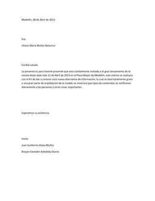 El documento contiene varias invitaciones para asistir al lanzamiento de la revista Klock-Style el 11 de abril de 2013 en la Plaza Mayor de Medellín. El evento tiene el objetivo de dar a conocer esta nueva fuente de información que se distribuirá gratuitamente y mostrará el tipo de contenido que notificará diariamente a la población de la ciudad.