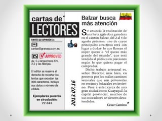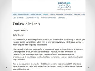 Las cartas de lectores no son un género periodístico estricto, sino textos breves en los que los lectores expresan opiniones y dialogan con los medios. Estas cartas permiten a los medios conocer la opinión del público y el impacto de su información, y deben cumplir con ciertas políticas de extensión y contenido para ser publicadas. El proceso de redacción implica seguir una estructura formal, comenzando con una idea principal y finalizando con la firma del autor.