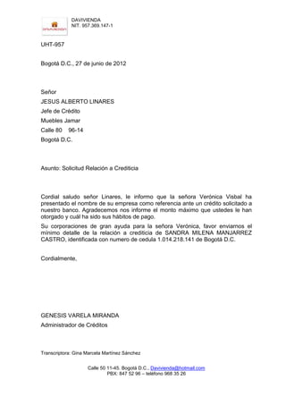El documento contiene varias cartas relacionadas con la solicitud de crédito de Sandra Milena Manjarrez Castro en Davivienda. Inicialmente, Davivienda solicita información sobre los hábitos de pago de Sandra a otras empresas para evaluar su solicitud. Posteriormente, Davivienda niega el crédito debido a la falta de capacidad de endeudamiento de Sandra pero sugiere invertir en CDT. Finalmente, Davivienda acepta otorgarle el crédito a Sandra y le indica que deberá abrir una cuenta de ahorros.