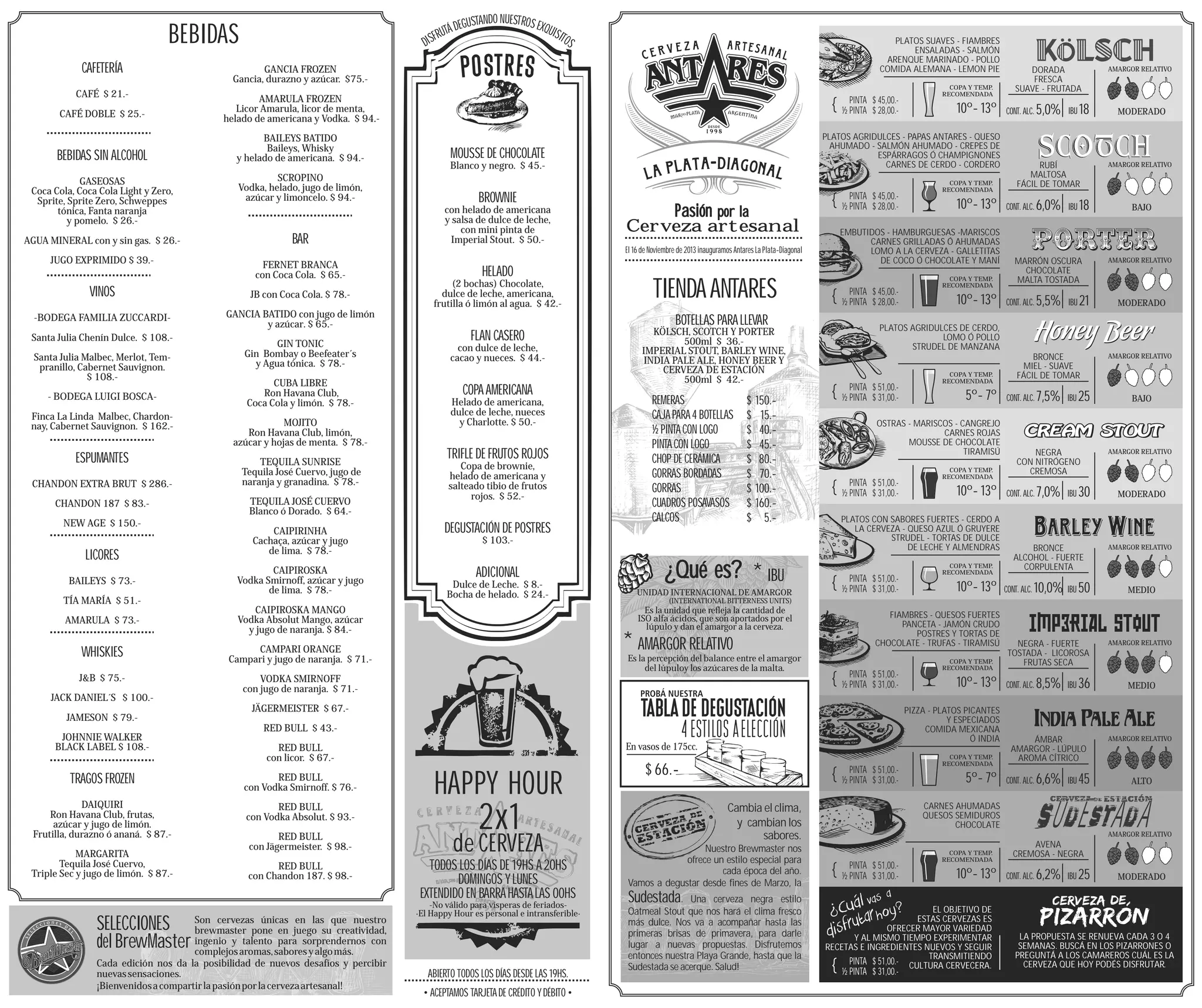 Este documento presenta el menú de comidas y bebidas de un bar. Incluye opciones de café, bebidas alcohólicas y sin alcohol, comidas como sandwiches y platos principales, y postres. También describe las diferentes cervezas artesanales que ofrece, incluyendo estilo, IBU, y recomendaciones de maridaje. El bar acepta tarjetas de crédito y débito y ofrece promociones de 2x1 en cerveza durante el happy hour.