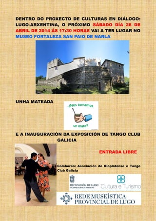 El próximo sábado 26 de abril a las 17:30 horas en el Museo Fortaleza San Paio de Narla tendrá lugar la inauguración de una exposición fotográfica de Tango Club Galicia y una actuación del grupo Xesta Verde de Friol. La exposición y actuación forman parte del proyecto de Culturas en Diálogo: Lugo-Argentina.