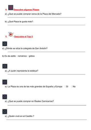 Este documento presenta una actividad interactiva sobre la ciudad de Medina del Campo en España. Instruye a los estudiantes a explorar un mapa en línea con varios símbolos que representan lugares religiosos, palacios, plazas y el top 5 de atracciones. Luego hace una serie de preguntas sobre detalles específicos que los estudiantes pueden descubrir sobre la música, religión, arquitectura e historia de la ciudad.