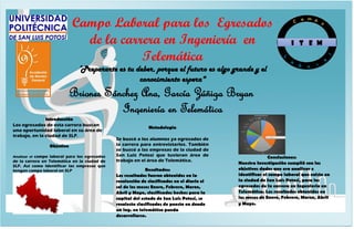 El documento analiza el campo laboral para los egresados de ingeniería en telemática en la ciudad de San Luis Potosí, México. Los autores entrevistaron a egresados y empresas de la ciudad para identificar oportunidades laborales. Recopilaron clasificados de enero a mayo que mostraban puestos disponibles para ingenieros en telemática. Concluyeron que su investigación cumplió el objetivo de analizar e identificar el campo laboral existente en la ciudad para egresados de esta carrera.