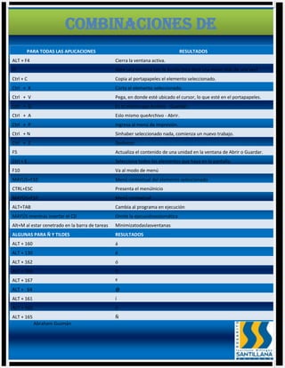 Este documento lista combinaciones de teclas comunes en aplicaciones de computadora. Algunas combinaciones populares incluyen Alt + F4 para cerrar una ventana, Ctrl + C para copiar, Ctrl + X para cortar, Ctrl + V para pegar, y Ctrl + Z para deshacer. También incluye combinaciones para ingresar caracteres con tildes como Alt + 164 para ñ.