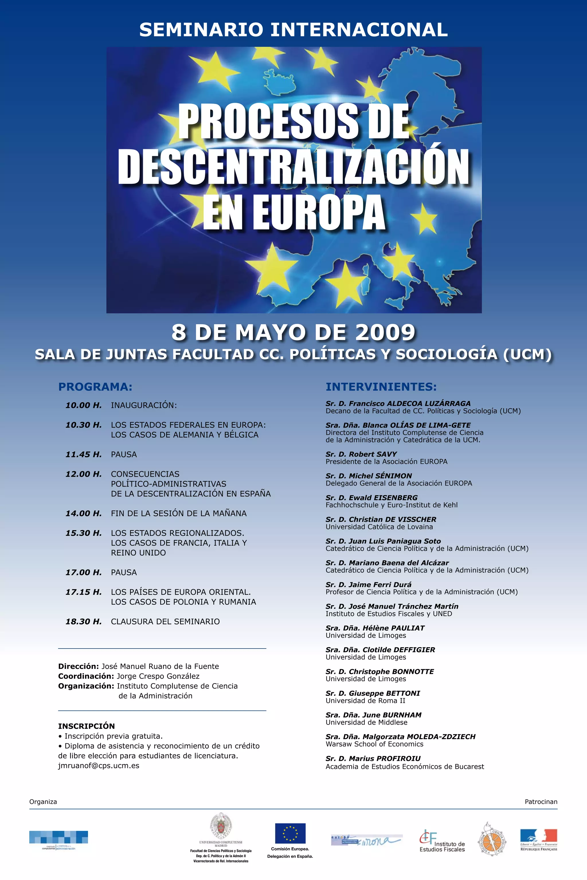 Este documento presenta el programa de un seminario internacional sobre procesos de descentralización en Europa que tendrá lugar el 8 de mayo de 2009 en la Facultad de Ciencias Políticas y Sociología de la Universidad Complutense de Madrid. El seminario contará con ponentes de universidades europeas que analizarán casos de descentralización en países de la Unión Europea como Alemania, Bélgica, España, Francia, Italia, Reino Unido, Polonia y Rumania. El seminario concluirá con un acto de clausura.