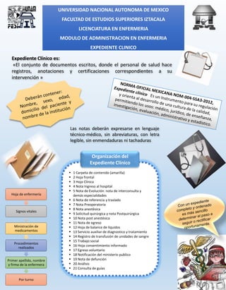 El expediente clínico es el conjunto de documentos escritos donde el personal de salud registra sus intervenciones. Debe contener anotaciones en lenguaje técnico-médico, sin abreviaturas y con letra legible. Incluye hojas de enfermería, signos vitales, administración de medicamentos y procedimientos realizados. La organización del expediente clínico comprende carpetas de contenido, hojas de ingreso, evolución, referencia, preoperatoria, postoperatoria, egreso y defunción.