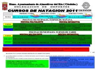 Este documento presenta el horario de las piscinas municipales para las tres tandas de verano, del 1 de julio al 31 de agosto. Se dividen los horarios en turnos de mañana y tarde para diferentes niveles de edad. También se proporciona información sobre la inscripción, los costos y la clausura de fin de temporada.