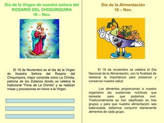 El documento presenta varias fechas conmemorativas en Venezuela durante los meses de noviembre y diciembre, incluyendo el Día del Estudiante el 21 de noviembre, el Día del Músico el 22 de noviembre, el Día de la Virgen de Nuestra Señora del Rosario del Chiquinquira el 18 de noviembre, y el Día de Todos los Santos el 1 de noviembre.