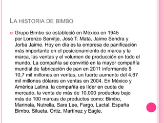 Grupo Bimbo se estableció en México en 1945 y hoy es la empresa líder mundial en panificación. Ofrece más de 10,000 productos bajo 100 marcas que incluyen pan, bollos, pan tostado, empanizadores, barras y pan dulce. La cartera de productos cubre una amplia variedad de opciones para satisfacer las necesidades de los consumidores.
