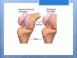 El cartílago es un tejido conectivo elástico y resistente formado por células y fibras que proporciona fuerza y flexibilidad a las articulaciones. Está compuesto principalmente de condrocitos y carece de vasos sanguíneos, por lo que obtiene nutrientes a través de la matriz celular. Existen tres tipos principales de cartílago: el cartílago hialino, el más abundante y rosado; el fibroso, con fibras de colágeno densas; y el elástico.