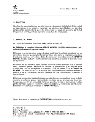 Este documento presenta los conceptos fundamentales de salud y trabajo desde tres perspectivas: