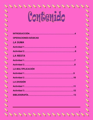 Este documento presenta actividades sobre las cuatro operaciones básicas de matemáticas (suma, resta, multiplicación y división) para estudiantes de tercer grado. Incluye problemas y ejercicios prácticos sobre cada operación con el objetivo de reforzar el desarrollo lógico-matemático de los estudiantes. También incluye una bibliografía de recursos adicionales en línea sobre las operaciones básicas.