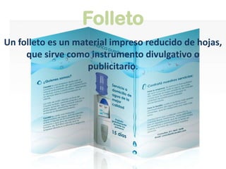 El documento define y describe varios tipos de documentos relacionados con negocios y marketing, incluyendo cartillas, folletos, plegables, brochures, portafolios de servicios, planes de negocios y diseño corporativo. Cada uno tiene un propósito específico como anotar datos oficiales, promover información, mostrar servicios e imágen de una empresa, presentar la historia y oferta de una compañía, describir un nuevo negocio y establecer una apariencia visual coherente.
