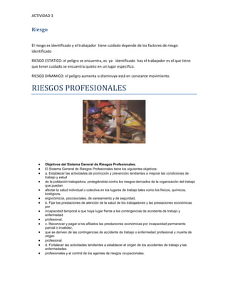 El documento describe los diferentes tipos de riesgos a los que pueden estar expuestos los trabajadores, incluyendo riesgos físicos, químicos, biológicos y psicosociales. Explica que un riesgo es la posibilidad de que suceda un evento perjudicial y depende de factores como la frecuencia con que ocurre. Los objetivos del sistema general de riesgos profesionales son establecer actividades de prevención, fijar prestaciones de salud para los trabajadores, y reconocer indemnizaciones por accidentes o en