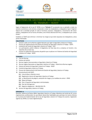 Este documento presenta la información sobre un curso de Sistema de Gestión de Seguridad y Salud en el Trabajo. Explica los objetivos del curso, el temario que incluye conceptos como ciclo de Deming, sistema de gestión, normas legales nacionales e internacionales, y documentación requerida para el SGSST. También describe el Comité de Seguridad y Salud en el Trabajo y su función de promover la seguridad en el trabajo. El curso está dirigido a gerentes, personal de recursos humanos, y miembros de