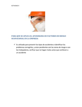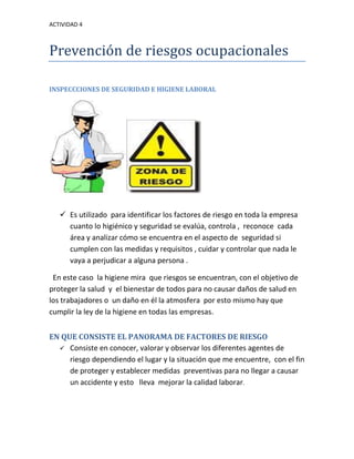 Este documento describe inspecciones de seguridad e higiene laboral que se utilizan para identificar factores de riesgo en las empresas y garantizar el cumplimiento de las leyes de higiene. Consisten en conocer y evaluar los diferentes agentes de riesgo en cada área para establecer medidas preventivas y proteger la salud y el bienestar de los trabajadores. El objetivo del panorama de factores de riesgo ocupacional es prevenir accidentes, identificar problemas y corregirlos para mejorar la calidad laboral.