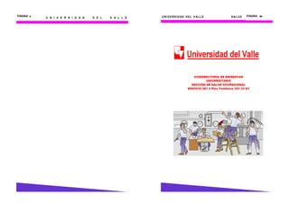 Este documento presenta una cartilla sobre los Elementos de Protección Personal (EPP) para los servidores públicos de la Universidad del Valle. Explica la definición de los EPP, su clasificación según la normativa legal, y describe cada EPP detallando su uso, mantenimiento y aplicación según el riesgo laboral. El objetivo es promover un ambiente de trabajo saludable a través del uso adecuado de los EPP.