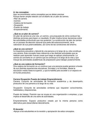 Este documento presenta conceptos clave relacionados con el diseño de un plan de carrera, incluyendo plan de carrera, carrera, cadena de formación, ocupación, puesto de trabajo y emprendimiento. Explica que un plan de carrera es una ruta para lograr un resultado a través de decisiones sobre actividades productivas. Una carrera se refiere a las actividades educativas y laborales de una persona a lo largo de su vida. Una cadena de formación es un continuo de experiencias educativas que habilita el acceso al mundo productivo