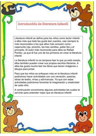 El documento habla sobre la literatura infantil. Explica que a los niños les gusta leer cuentos clásicos con ilustraciones. También les gusta crear sus propios escritos y narrativas. El documento propone algunas actividades para que los niños se enfoquen más en la literatura infantil, como narración de cuentos, poesía, obras de teatro y adivinanzas. Estas actividades fomentan la imaginación y creatividad.