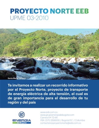 El documento presenta información sobre el Proyecto Norte, un proyecto de transporte de energía eléctrica de alta tensión en Colombia. El proyecto consiste en la construcción de tres líneas de transmisión y tres subestaciones eléctricas entre las zonas de Chivor, Norte y Bacatá. El objetivo del proyecto es garantizar el suministro confiable de energía eléctrica, ampliar el acceso a este servicio y expandir la red de transmisión nacional para atender las necesidades de las regiones Centro y Oriente del país.