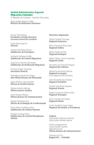 Este documento presenta una guía de políticas y servicios para migrantes en Colombia. Resume el marco legal internacional, regional y nacional que protege los derechos de los migrantes. Explica la dinámica migratoria en el país y establece directrices para garantizar los derechos humanos de los migrantes en procesos como el control migratorio y la extranjería. Finalmente, propone líneas de acción en áreas como la prevención, protección, cooperación interinstitucional e investigación.