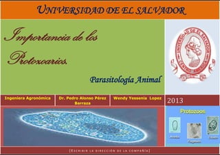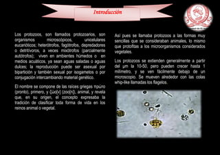Este documento describe los protozoarios, organismos microscópicos unicelulares eucarióticos. Explica que son heterótrofos, fagótrofos o detritívoros y se reproducen de forma asexual o sexual. Además, clasifica los protozoarios en cinco grupos según su forma de locomoción y describe algunas enfermedades infecciosas causadas por protozoarios como la coccidiosis bovina, la babesiosis bovina y la anaplasmosis.