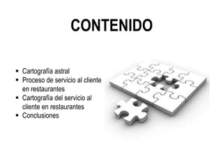 Este documento describe la cartografía del servicio al cliente en restaurantes. Primero explica cómo se creó el zodíaco mediante la clasificación y nombramiento de estrellas y constelaciones. Luego describe el proceso de servicio al cliente en restaurantes y sus posibles ineficiencias. Finalmente, presenta un modelo que mapea las características clave del servicio al cliente en cada etapa y concluye que esto puede crear un lenguaje común para estandarizar el servicio.