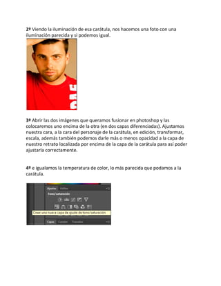 Este documento proporciona un tutorial en 6 pasos para crear una carátula personalizada fusionando una foto propia con una imagen de portada existente en Photoshop. Los pasos incluyen elegir una portada, tomar una foto con iluminación similar, colocar las imágenes una encima de la otra, ajustar el tamaño y opacidad, igualar la temperatura de color, crear una máscara de capa para reemplazar la cara original con la propia, y aplicar filtros para igualar los efectos.