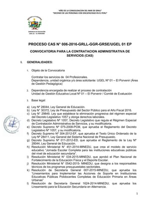 Este documento describe el proceso de contratación administrativa de servicios para contratar a 4 profesionales como Acompañantes Pedagógicos de Redes de Educación Física en la UGEL 01 - El Porvenir. Incluye el perfil requerido, las características y condiciones del puesto, el cronograma del proceso de selección y la documentación a presentar. El proceso consta de 2 etapas de evaluación: evaluación curricular y entrevista personal, con un puntaje mínimo total de 70 puntos para ser adjudicado.