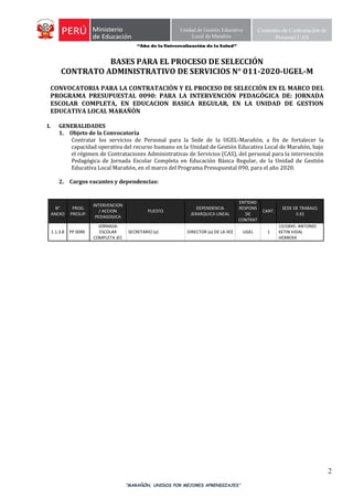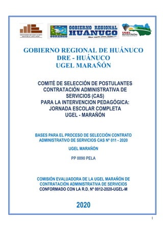 Este documento presenta las bases para el proceso de selección de contrato administrativo de servicios CAS No 011-2020 de la Unidad de Gestión Educativa Local Marañón para contratar personal para la intervención pedagógica de Jornada Escolar Completa. Se detallan los cargos vacantes, requisitos, evaluación curricular y entrevista personal para seleccionar al candidato con mayor puntaje para el puesto de Secretario(a) en la Institución Educativa "Antonio Ketín Vidal Herrera".