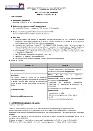 Este documento describe un proceso de selección para contratar a un Analista en Planificación en el Registro Nacional de Identificación y Estado Civil (RENIEC). Se especifican los requisitos para el puesto, que incluyen una licenciatura en economía, administración o estadística y al menos 6 años de experiencia general. El proceso consta de una evaluación curricular y una entrevista personal. El documento también detalla el cronograma del proceso de selección, los criterios de evaluación y la documentación requerida.