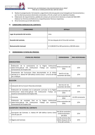 Este documento describe un proceso de selección para contratar a dos Analistas en Gestión Administrativa en el Registro Nacional de Identificación y Estado Civil del Perú. Incluye el perfil requerido, funciones del puesto, cronograma del proceso de selección en varias etapas, criterios y documentación necesaria para postular, y detalles sobre la evaluación, contratación y bonificaciones. El proceso busca cubrir puestos en la Gerencia de Registro Electoral cumpliendo con los requisitos legales aplicables a contratos de servicio en el sector público