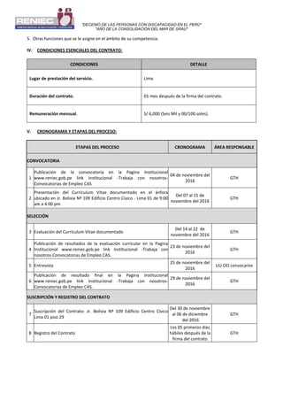 Este documento describe el proceso de selección para contratar a un abogado en el Registro Nacional de Identificación y Estado Civil (RENIEC). Se busca a alguien con título en derecho, maestría en derecho civil o constitucional, y al menos 8 años de experiencia general y 4 años como abogado. El proceso incluye la evaluación del currículum, entrevista, y publicación de resultados. El contrato será por un mes en Lima con un salario de S/ 6,000. Se otorgan bonificaciones a militares licenciados y personas con discapac