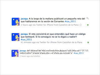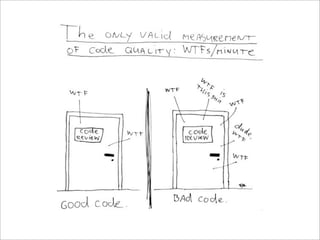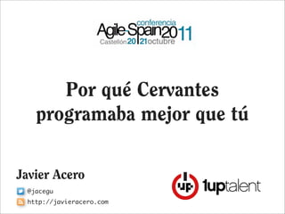 Este documento discute la importancia de escribir código legible y de calidad. Señala que Cervantes probablemente programaba mejor que muchos programadores modernos debido a su enfoque en la claridad y simplicidad. También cubre principios de diseño de software como acoplamiento, duplicación, encapsulación y pruebas unitarias. En general, enfatiza que un código bien escrito debe ser fácil de leer y entender.