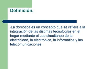 El documento describe la casa domótica, que integra tecnologías como la electricidad, electrónica, informática y telecomunicaciones para automatizar una vivienda y mejorar la seguridad, confort y ahorro energético. Explica aplicaciones como iluminación, alarmas y control de electrodomésticos, así como elementos como sensores, actuadores y redes inalámbricas para conectarlos. Finalmente, menciona algunas series y películas que incluyen casas domóticas.
