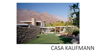 Richard Neutra diseñó la Casa Kaufmann en California en 1946. Neutra era un arquitecto modernista austriaco que buscaba integrar a los humanos con la naturaleza para mejorar su calidad de vida. La Casa Kaufmann presentaba espacios interiores diáfanos y luminosos con vistas al paisaje, usando nuevos materiales como el vidrio y el acero.