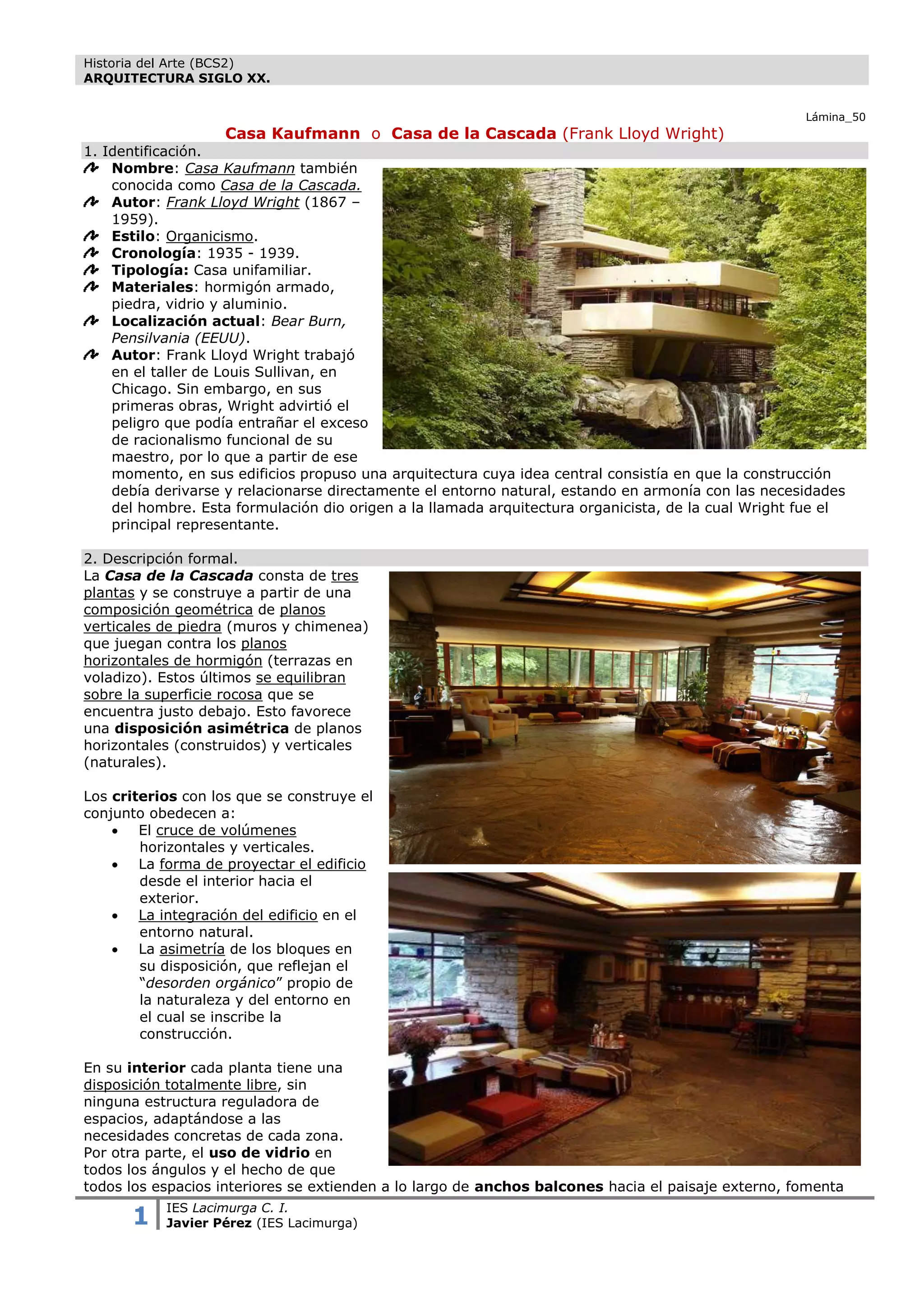 La Casa Kaufmann, diseñada por Frank Lloyd Wright entre 1935 y 1939, es un notable ejemplo de arquitectura organicista que busca la integración con el entorno natural de Pensilvania. Esta vivienda unifamiliar presenta una asimetría de formas y una disposición libre de los espacios, promoviendo una intercomunicación entre interiores y exteriores. La obra refleja la filosofía de Wright sobre la relación entre el ser humano y la naturaleza, incorporando innovaciones modernas para maximizar la comodidad.