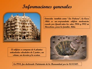 La Casa Milá, también conocida como "La Pedrera", es un edificio modernista de 6 plantas construido entre 1906 y 1912 en Barcelona por el arquitecto Gaudí para la familia Milá. La fachada ondulada de piedra gris está inspirada en las formas de la naturaleza, mientras que el interior presenta decoraciones marinas como techos con movimientos de olas y columnas de piedra esculpidas. En 1984, la UNESCO declaró la Casa Milá como Patrimonio de la Humanidad.