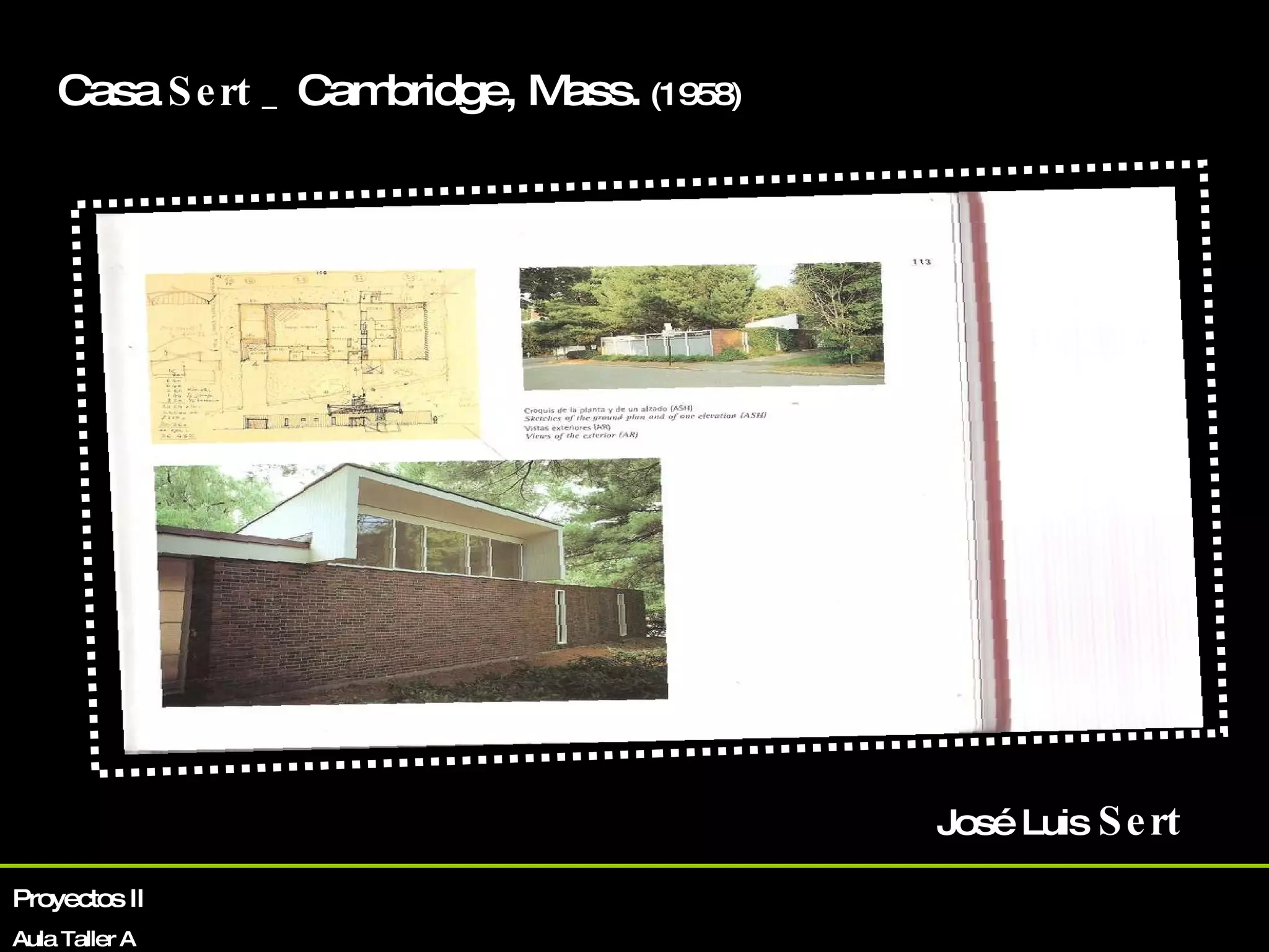 El documento describe la casa Sert, un proyecto residencial diseñado por el arquitecto José Luis Sert en Cambridge, Massachusetts en 1958. La casa se organiza en torno a tres patios y se aísla del exterior mediante muros. Sert se inspiró en proyectos anteriores como viviendas en Locust Valley y un pabellón en París, que también utilizaban patios definidos por muros. El documento incluye planos, secciones, maquetas e imágenes del interior y exterior de la casa Sert.