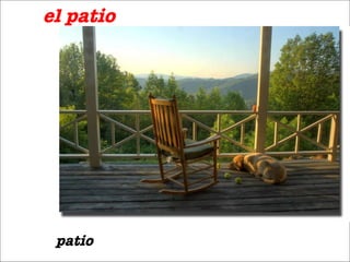 El documento presenta vocabulario relacionado con la casa. Primero se enfoca en las áreas exteriores como el patio, la piscina, el jardín y el garaje. Luego describe las áreas interiores incluyendo la cocina, el comedor, la sala de estar, el baño y diferentes cuartos como la alcoba, el cuarto de los niños y el estudio. El documento también incluye un actividad para que los estudiantes diseñen su propia casa y etiqueten los diferentes espacios y muebles.