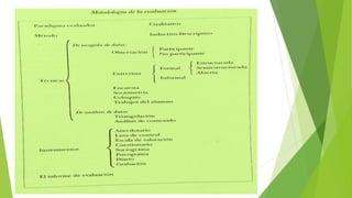 El documento presenta diferentes técnicas e instrumentos para la evaluación educativa, incluyendo la observación, entrevista, sociometría, coloquio, análisis de trabajos de estudiantes y análisis de datos. Explica cómo se debe planificar y sistematizar la observación, los tipos de entrevistas, y proporciona ejemplos de instrumentos como listas de control, escalas de valoración, cuestionarios y sociogramas.
