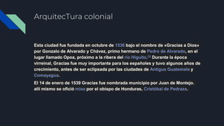 El documento describe la arquitectura colonial de la ciudad de Gracias Lempira en Honduras. Fue fundada en 1536 y durante la época virreinal fue importante para los españoles. Aún se conservan casas y locales comerciales coloniales que respetan las reglas del casco histórico, como el Hotel Real Camino Lenca. También se menciona la Iglesia La Merced, uno de los tesoros arquitectónicos coloniales que conserva detalles desde su construcción y es un atractivo turístico.