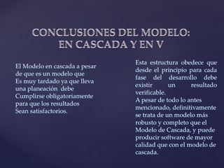 1. El modelo en V es conocido como el modelo de cuatro niveles y representa el proceso de desarrollo de software como una sucesión de etapas que producen productos intermedios. 2. Las cuatro etapas son análisis de requisitos y especificación, análisis funcional, arquitectura del sistema e implementación. 3. La parte izquierda de la V representa la definición de especificaciones mientras que la parte derecha representa la verificación contra las especificaciones definidas.